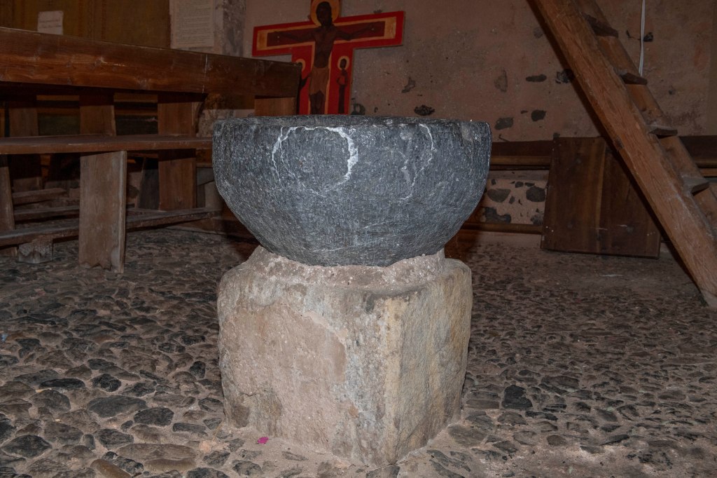 L’aspect extérieur renforce l’idée d’un édifice conçu pour tenir. La pierre est très dure d’un gris bleuté les murs sont épais percés de rares ouvertures étroites avec une façade tournée vers l’Occident. La porte principale en noyer massif comporte un panneau décoratif orné d’une statuette en bois de saint Étienne.