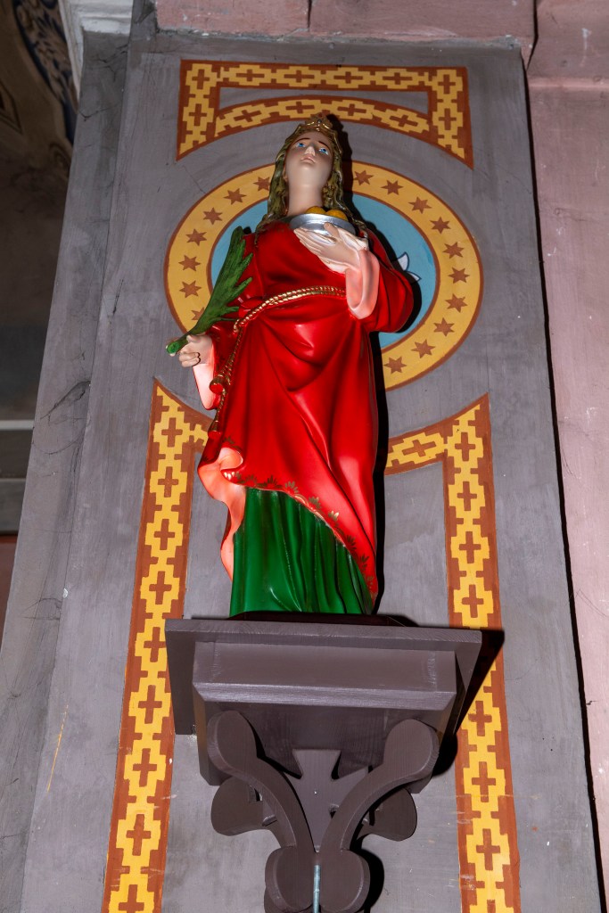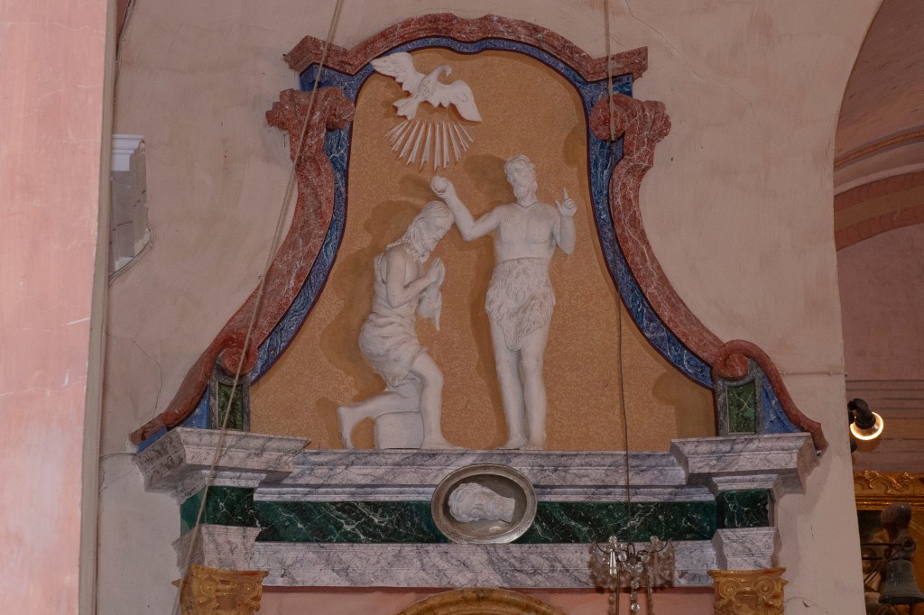 Son encadrement en pierre noire est surmonté d’une niche abritant une statue de Notre-Dame avec une représentation de saint Étienne et de saint Jean-Baptiste.