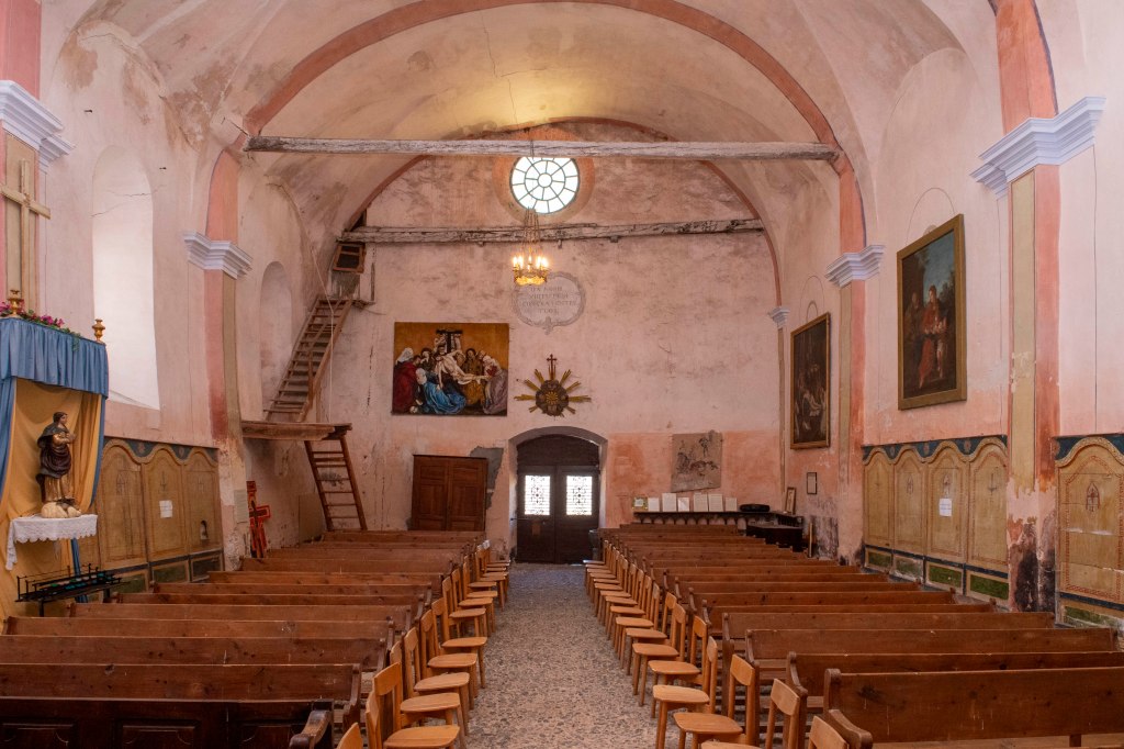 L’édifice est de grande taille, plus vaste que l’église paroissiale, avec des dimensions autour de 25 mètres par 10 mètres. La nef est rectangulaire, organisée en trois larges travées. Le chevet est plat, étroit et surélevé. Le chœur est couvert d’une voûte en berceau plein cintre. Sur le flanc sud, l’éclairage est assuré par trois baies. Un pied d’autel médiéval est réemployé dans le parement nord, et des maçonneries médiévales sont visibles, notamment sur les parties basses de plusieurs murs.