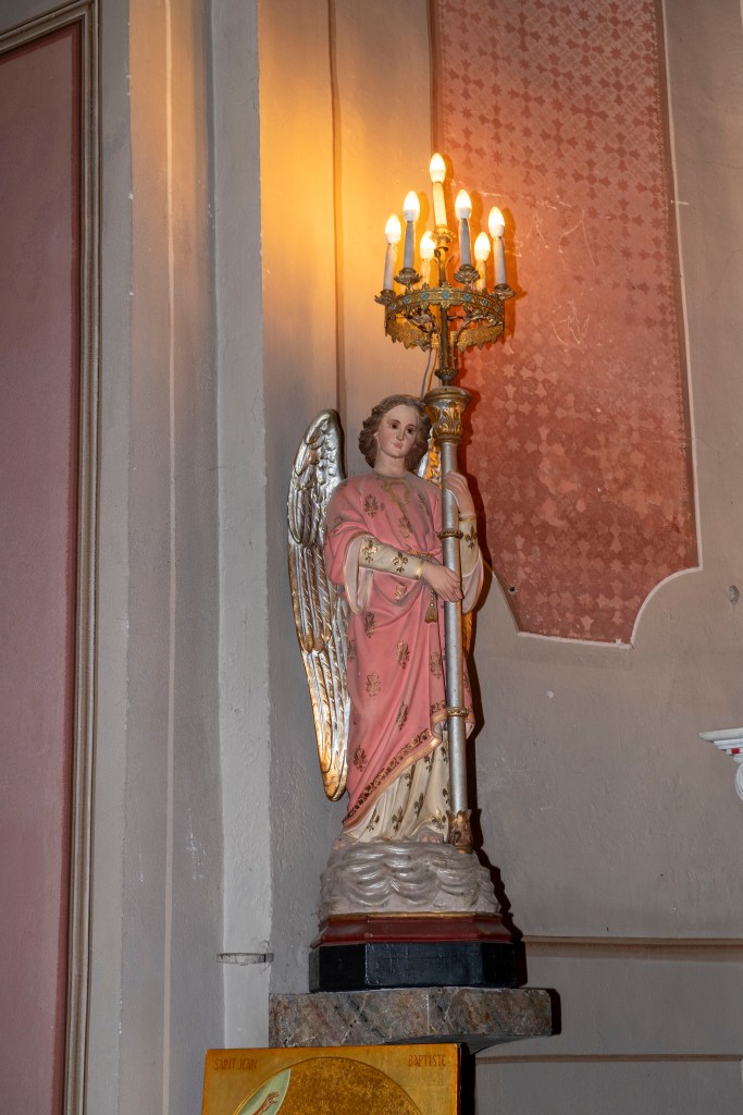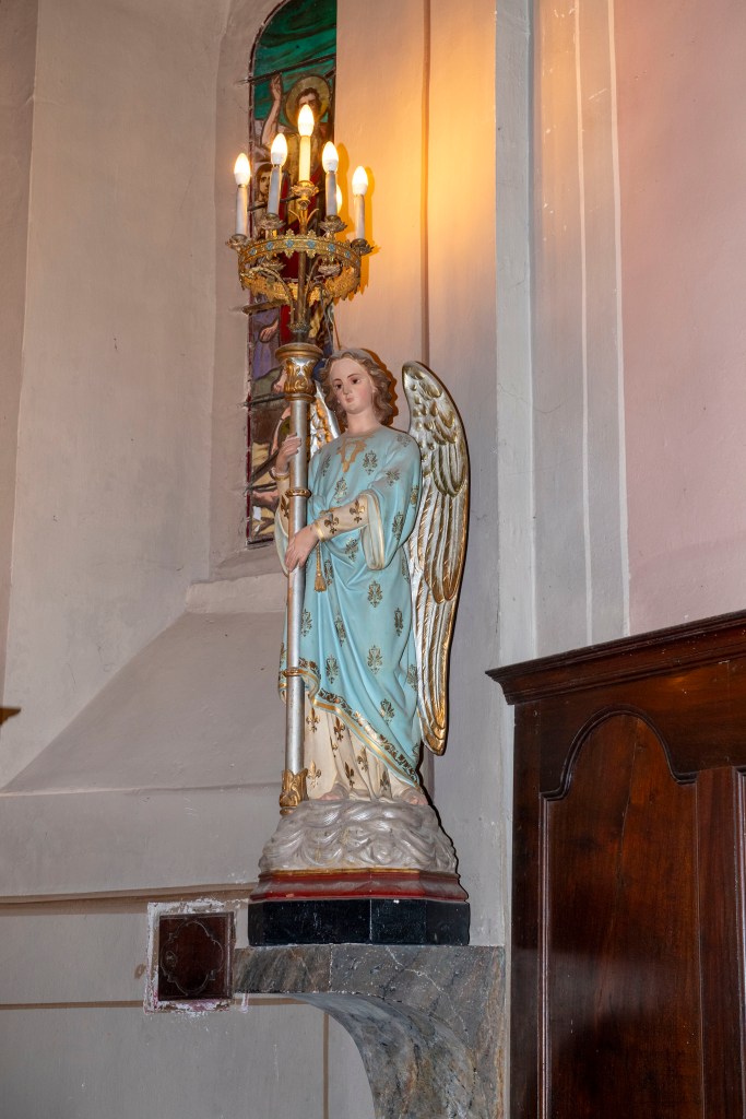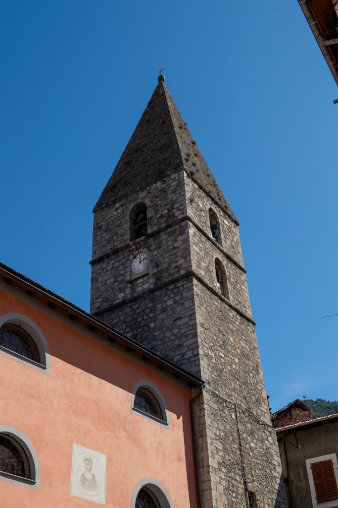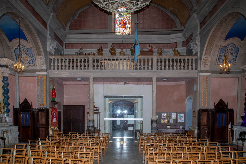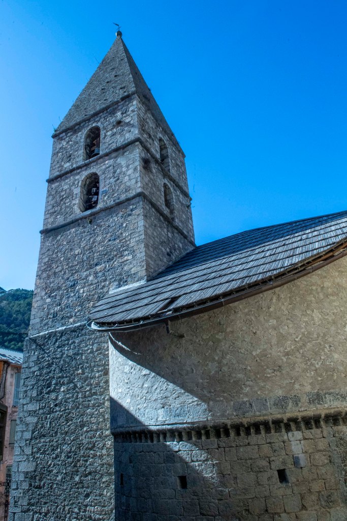 Le clocher-tour fait partie de l’identité du village. Il s’agit d’une haute tour carrée coiffée d’une flèche pyramidale. Sous la flèche, deux étages percés de fenêtres sur les quatre faces abritaient des fonctions communautaires : le “cabinet de la communauté”, c’est-à-dire le petit bureau de la commune d’autrefois, où les responsables du village se réunissaient et où l’on conservait les documents importants (registres, privilèges, archives).