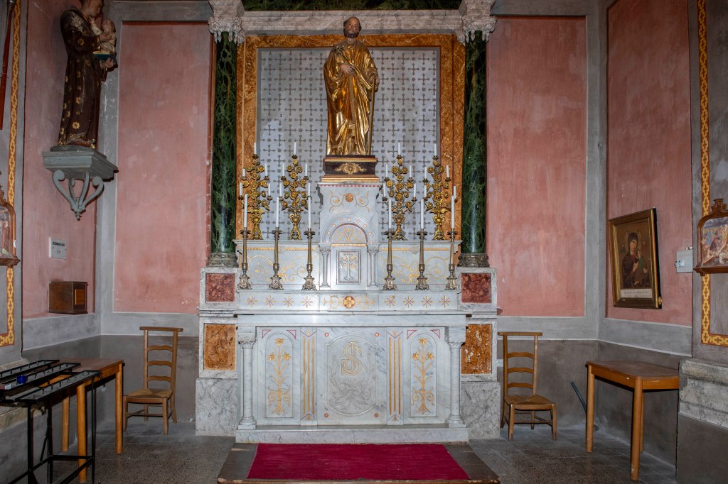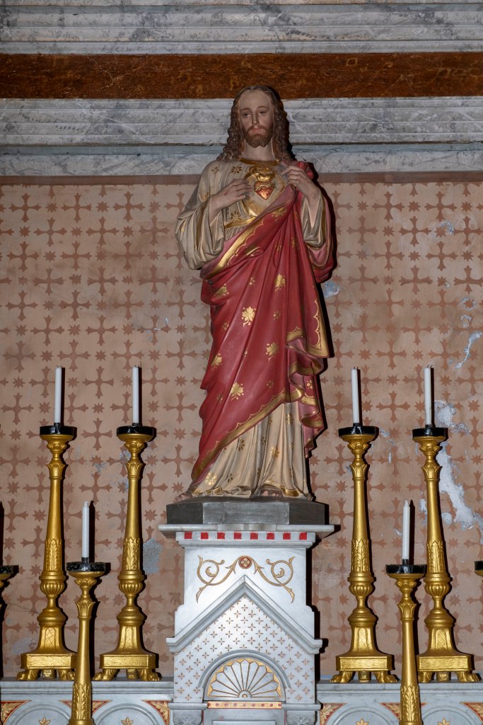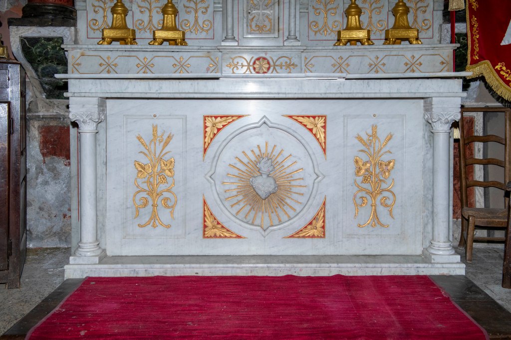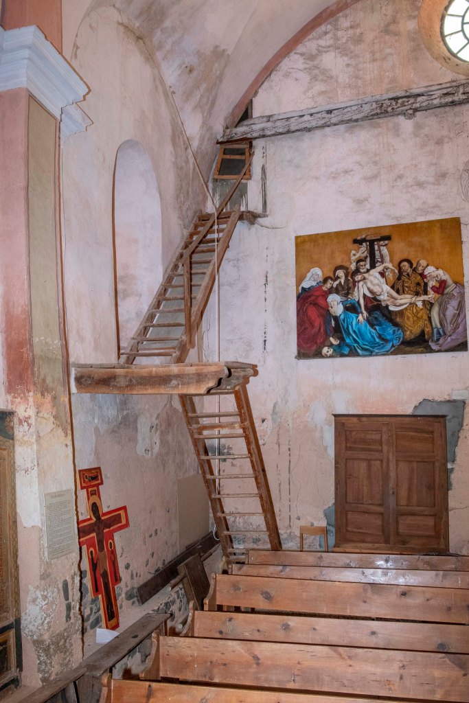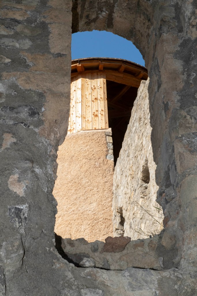 Le clocher-tour fait partie de l’identité du village. Il s’agit d’une haute tour carrée coiffée d’une flèche pyramidale. Sous la flèche, deux étages percés de fenêtres sur les quatre faces abritaient des fonctions communautaires : le “cabinet de la communauté”, c’est-à-dire le petit bureau de la commune d’autrefois, où les responsables du village se réunissaient et où l’on conservait les documents importants (registres, privilèges, archives).