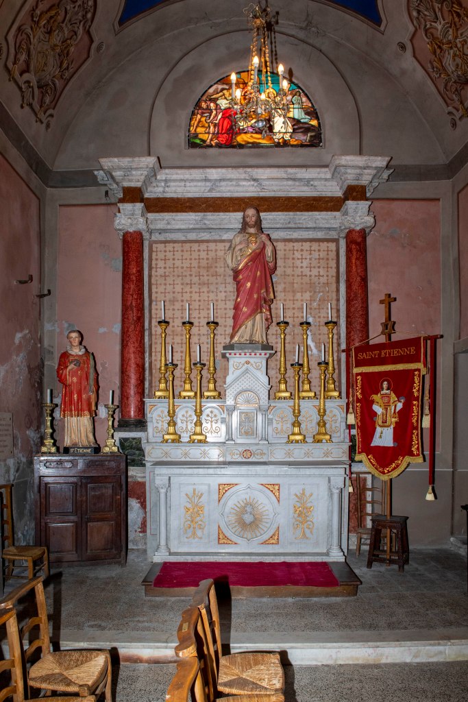 À l’intérieur la nef est couverte d’une voûte en plein cintre. Le chœur est rectangulaire et communique avec une sacristie dans la base du clocher. Le maître-autel occupe l’abside sous la voûte en cul-de-four. Encadrant le chœur, des niches à boiseries dorées présentent, à droite, une statue de saint Étienne agenouillé et à gauche la Vierge à l’Enfant.