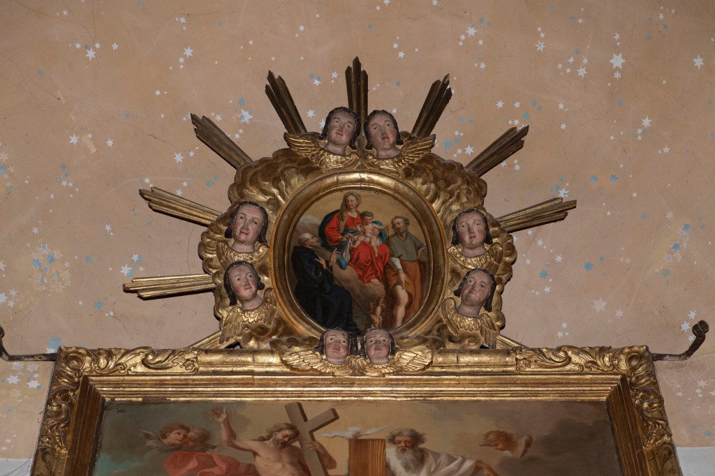 – Éléments d’un retable en bois peint (colonnades torses surmontées d’angelots et