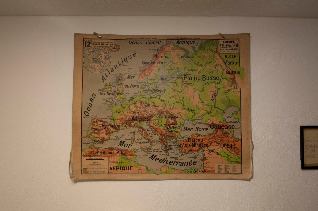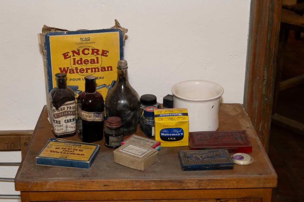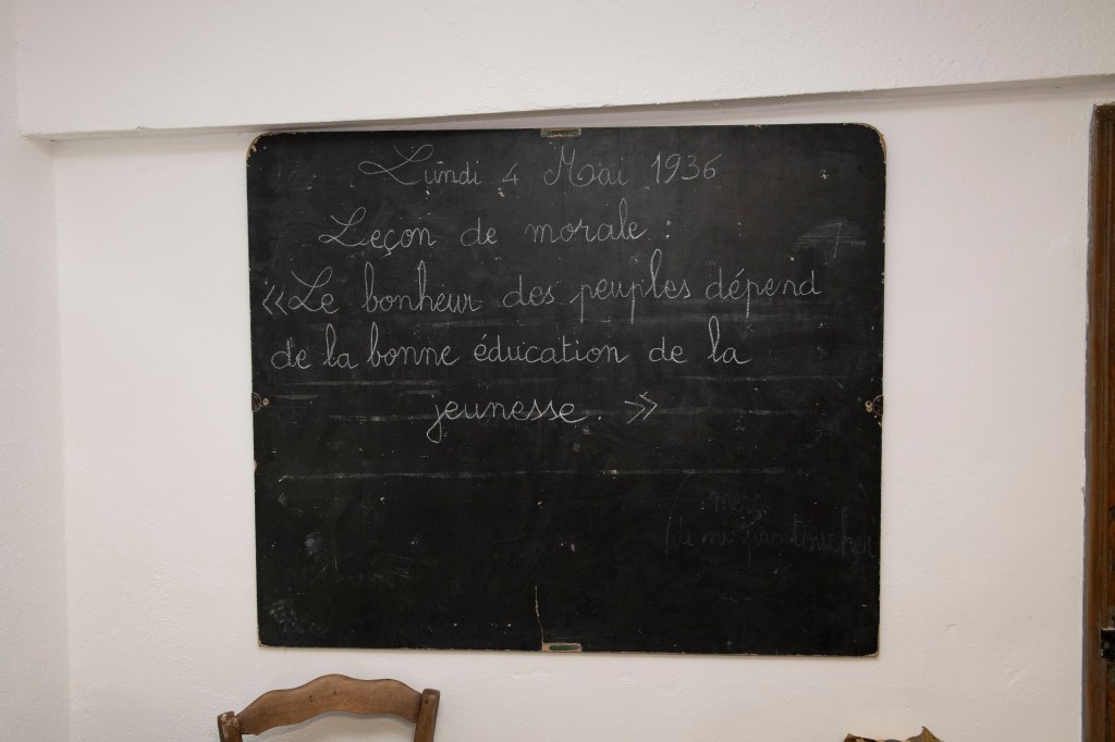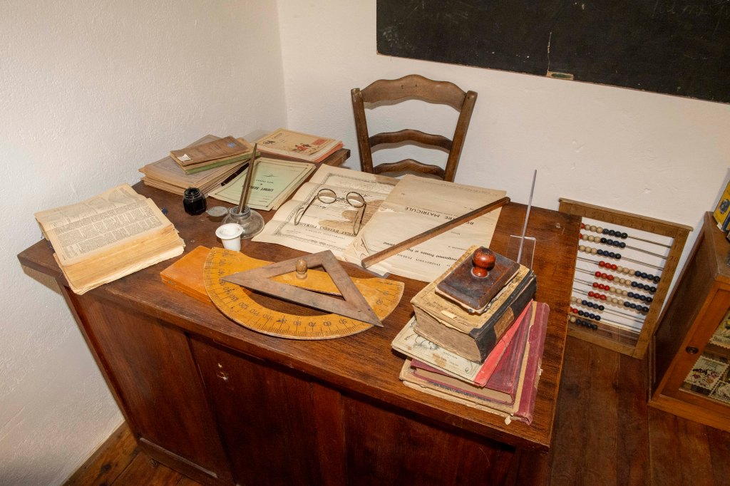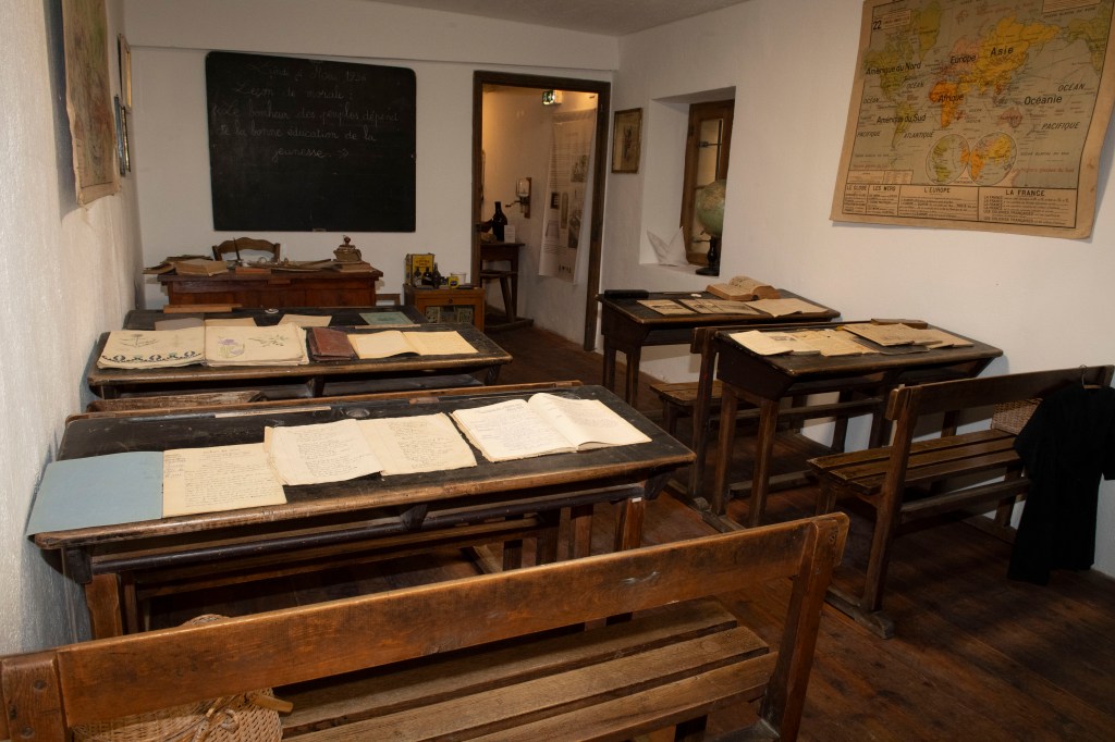 Le parcours s’ouvre sur l’école primaire telle qu’elle existait dans les hameaux et les villages de montagne. Les bancs, pupitres et encriers, les cahiers corrigés, les livres et le registre du maître fixent une réalité simple : l’instruction se fait dans un cadre matériel sobre, et la vie scolaire dépend directement des conditions climatiques. Une mention du registre résume cette contrainte sans commentaire : « 15 janvier, classe annulée, motif : neige ».