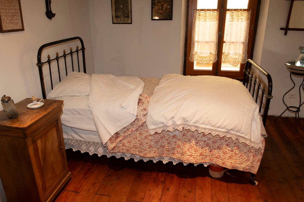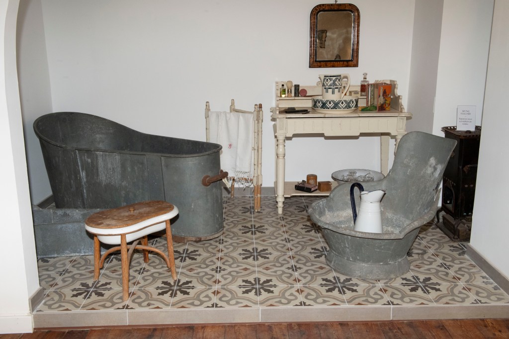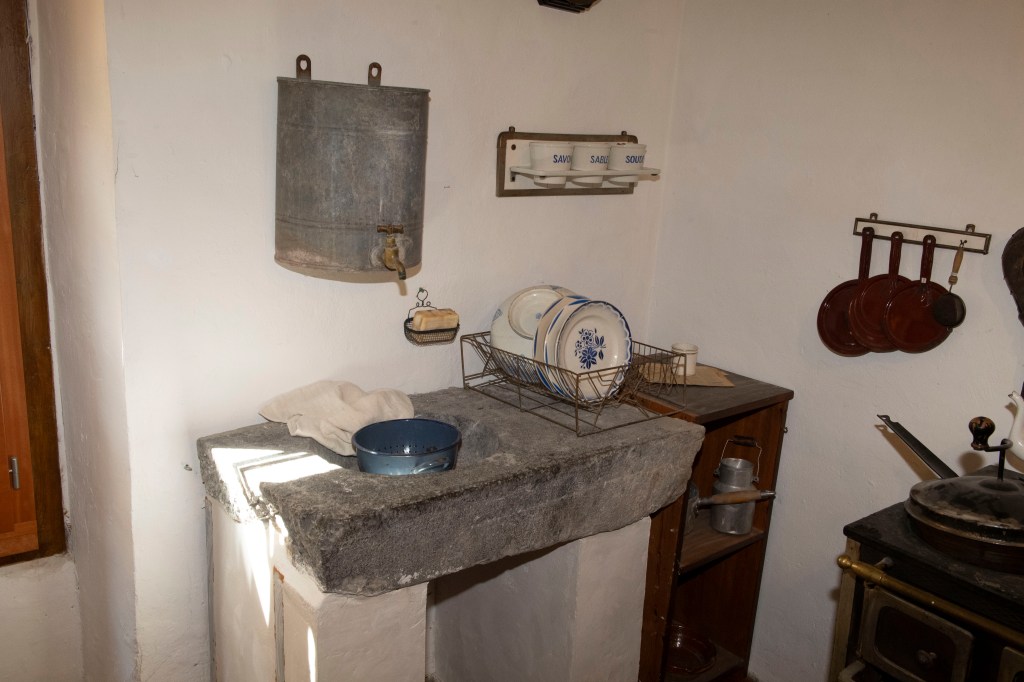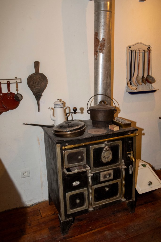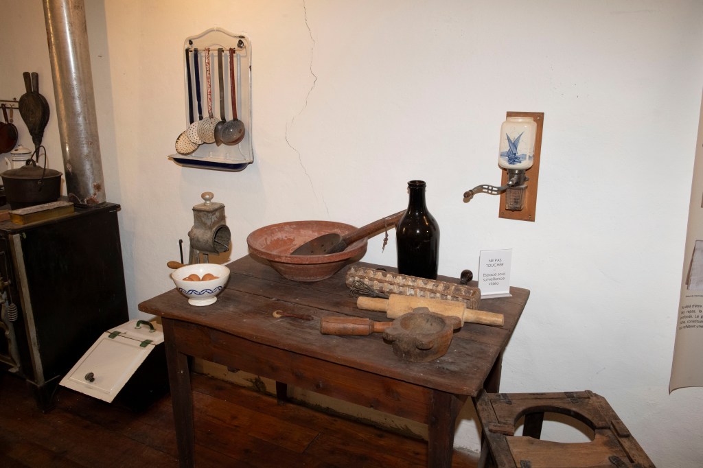 La seconde partie du musée reconstitue la maison avec une attention particulière portée à la cuisine comme pièce centrale. La cuisinière noire y apparaît comme l’équipement principal, à la fois pour la cuisson et pour le chauffage. Le mobilier, la table dressée, l’évier et le dispositif d’eau rappellent une contrainte concrète : l’eau n’est pas “à portée de robinet”. Un réservoir en fer, alimenté régulièrement, suppose que l’eau soit montée depuis la rue et stockée, puis utilisée avec économie.